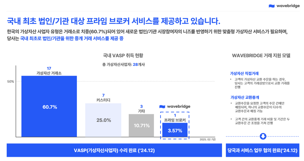 특히 웨이브릿지는 비트코인 현물 ETF 결제 과정에 참여하며, 금융기관과 협력해 한국이 디지털자산 PBS에서 주도권을 확보해나갈 수 있도록 노력하고 있습니다.