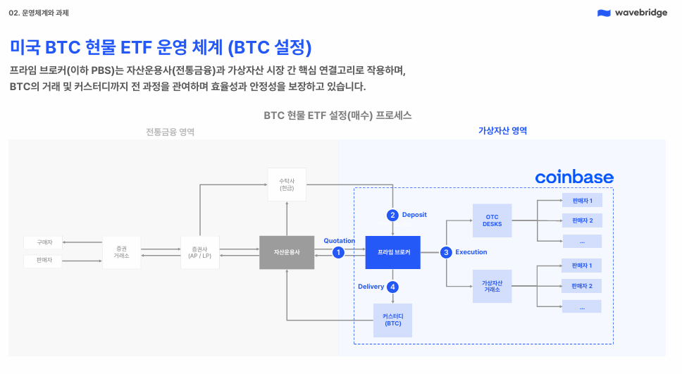블랙록은 비트코인을 ‘직접 사지 않습니다’. ETF 발행 시, 블랙록은 커스터디 기관에 현금(USD)을 납입하고, 이 현금은 디지털자산 PBS 전문업체인 코인베이스 프라임(Coinbase Prime)으로 전달됩니다. 코인베이스 프라임은 내부 기관 전용 풀 혹은 외부의 전문 기관 전문 브로커를 통해 장외 시장(OTC)에서 비트코인을 매입합니다. 이 과정을 통해 확보한 비트코인은 커스터디(수탁)되고, ETF 주식으로 전환됩니다. PBS는 이 전 과정을 설계하고, 집행하고, 리스크를 통제하는 주체입니다.