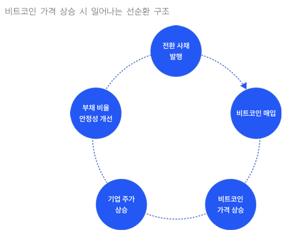 스트래티지의 재무 전략은 단일 자산에 대한 고집과 반복적인 전환사채 발행을 전제로 한 고레버리지 구조입니다. 먼저 전환사채를 발행해 자금을 조달하고, 그 자금으로 비트코인을 대량 매입합니다. 이후 비트코인 가격 상승에 따라 기업 자산가치와 주가가 함께 상승하면, 기존 전환사채가 주식으로 전환되면서 부채비율이 낮아집니다. 이는 다시 새로운 전환사채 발행 여력을 만들고, 이 자금으로 또다시 비트코인을 매입하는 순환 구조가 반복됩니다. 비트코인의 상승이 전제되는 자기강화형 구조이지만, 반대로 가격이 하락하면 주가 하락, 전환 실패, 자금조달 실패, 신용등급 하락이라는 역순환에 빠지게 되지요.