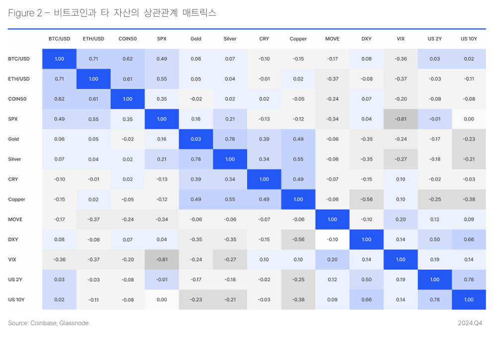 그 이유는 첫째로, ‘전략 자산’이라는 용어에 맞게, 다른 전통 자산군과 낮은 상관관계를 들 수 있습니다. 상관관계가 낮기에 리스크를 분산시키는 효과가 생깁니다. 비트코인은 2020~2024년 사이 S&P500과의 상관계수가 0.34, 금과는 0.12, 미국 10년물 국채와는 -0.08을 기록했습니다. 이는 비트코인이 기존 자산과는 전혀 다른 요인으로 움직이는 자산임을 의미합니다. 다시 말해, 분산 투자에 이상적인 조건을 갖추고 있다는 것이지요.