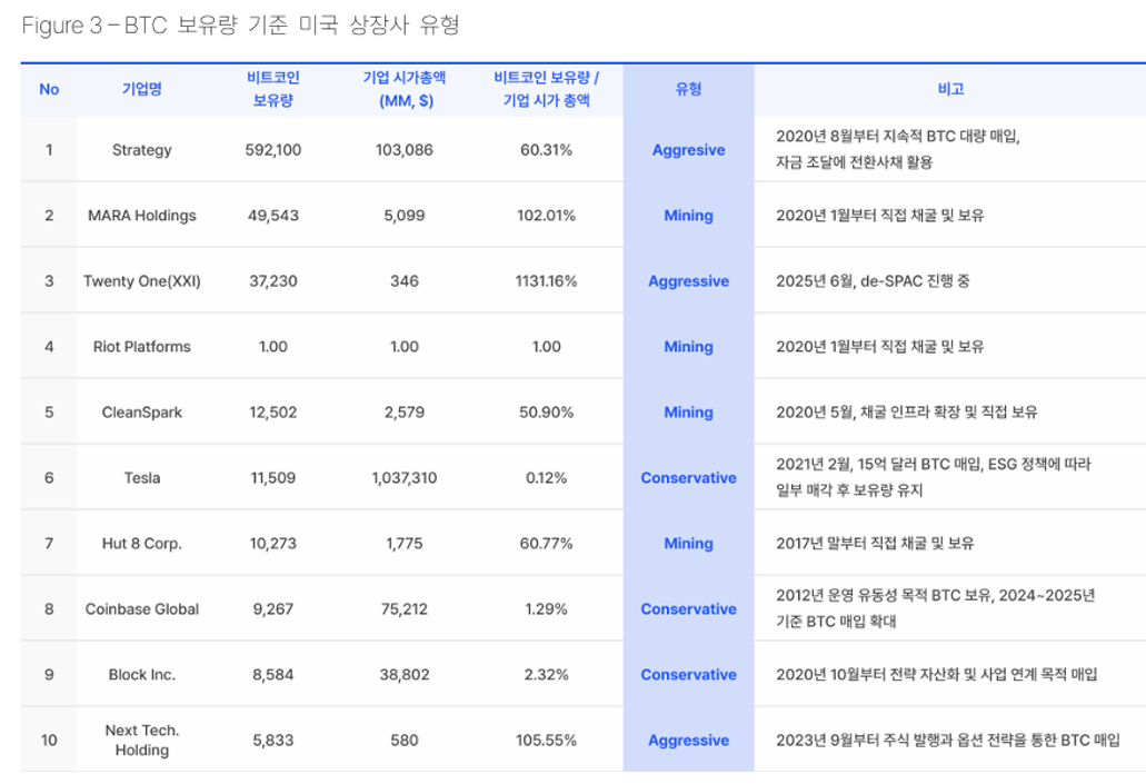 첫째는 비트코인 중심 경영(BTC-Native, Aggressive)으로, 스트래티지처럼 아예 기업가치 자체를 비트코인에 연동시키는 방식입니다. 둘째 방식인 채굴 기반 축적 전략(Mining Operation)은 미국의 일부 채굴 기업들이 선택하고 있지만, 한국에서는 현실적으로 불가능합니다. 셋째는 보수적 편입(Conservative Allocation)입니다. 이는 테슬라, 블록, 코인베이스 등이 선택한 전략으로, 전체 자산의 일부를 BTC로 보유해 분산 효과를 추구하는 방식입니다.