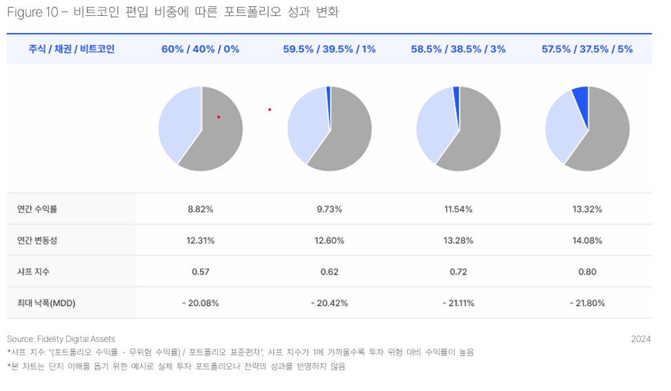 실제로 Fidelity의 분석에 따르면, 기존 60:40 포트폴리오에 비트코인을 1~5%만 편입해도 수익률과 샤프지수 모두가 개선됩니다. 특히 3% 편입 시 최대 낙폭은 -21.1%로 기존 포트폴리오 대비 1%포인트만 증가하며, 변동성 대비 기대 수익은 뚜렷이 개선되는 것을 볼 수 있습니다.