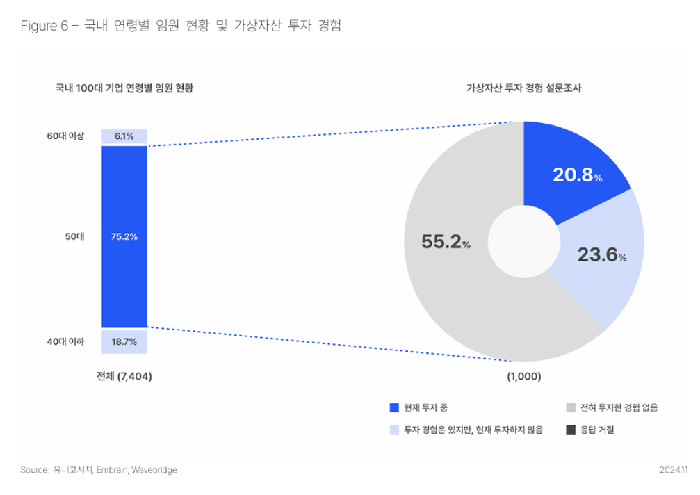 게다가 의사결정권자의 45% 이상은 디지털자산 투자 경험이 30~40대에 비해 적은, 50대 이상입니다. 전략팀, 기획팀, 신사업팀이 아무리 글로벌 사례와 수익률 데이터를 내세운다 해도, 실제 의사결정이 어려운 이유로 파악됩니다.