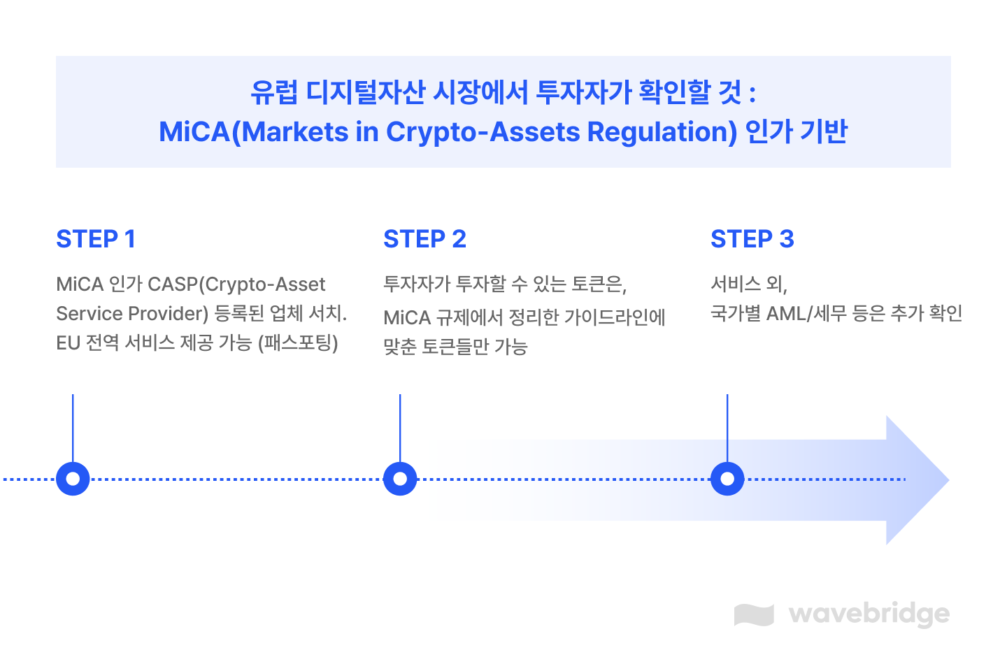 MiCA 인가를 취득하게 될 경우, Wavebridge EU는 유럽 27개 회원국에서 규제에 부합하는 신뢰할 수 있는 파트너로 자리매김할 수 있는 중요한 기반을 확보하게 되며, 이를 바탕으로 글로벌 디지털자산 시장 내 역할을 보다 확대해 나갈 계획입니다.