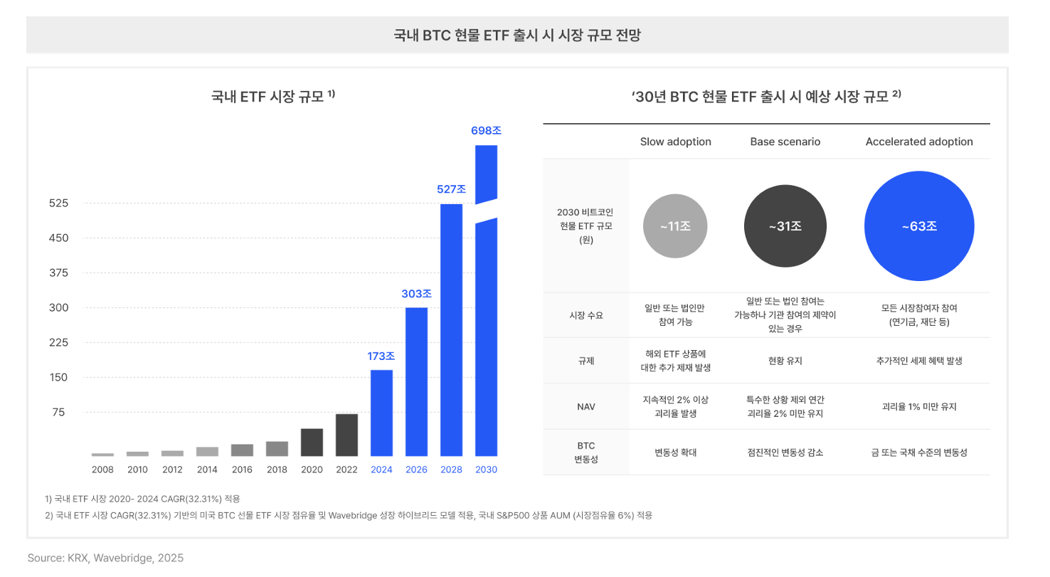 이 수치는 단순 추정치가 아니라, 여러 근거를 종합한 웨이브릿지의 모델링 결과입니다. 국내 ETF 시장의 성장률(2020~2024년 CAGR 32.31%)을 적용해 2030년 약 700조 원 규모로 확대될 것으로 가정하고, 미국 비트코인 선물 ETF 점유율과 국내 S&P500 ETF 점유율(6%)을 벤치마크했으며, 한국 특유의 리테일 강세와 기관 참여 확대를 반영한 하이브리드 성장 모델을 적용해 산출한 수치입니다.