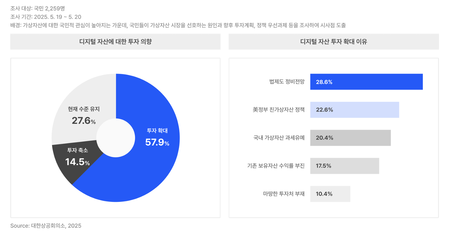현재 5,100만 인구 중 약 970만 명(32%)이 디지털자산 투자에 참여하며, 글로벌 평균 참여율(6.8%)의 약 4.7배 수준입니다. 최근 조사에서도 57.9%가 "앞으로 투자를 늘리겠다"고 답했으며, 그 이유로 가장 많이 꼽힌 것은 “법제도 정비 전망”(28.6%)이었습니다. 즉, 한국 시장은 투기를 넘어 제도적 안정성을 바탕으로 성숙 생태계를 향하고 있으며, 이는 ‘진짜 수요’에 기반한다는 점이 핵심입니다.